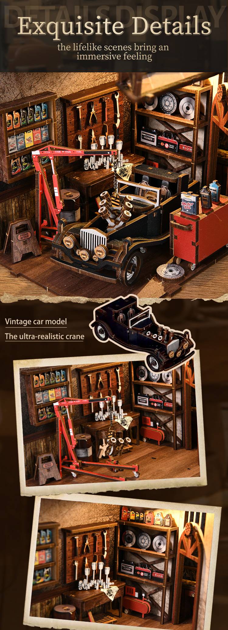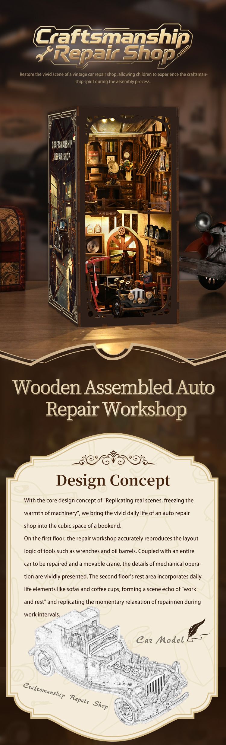 The core design concept of this Diy Book Nook Kit is “Replicating real scenes, freezing the warmth of machinery.” The kit brings the vivid daily life of an auto repair shop into the compact cubic space of a bookend.