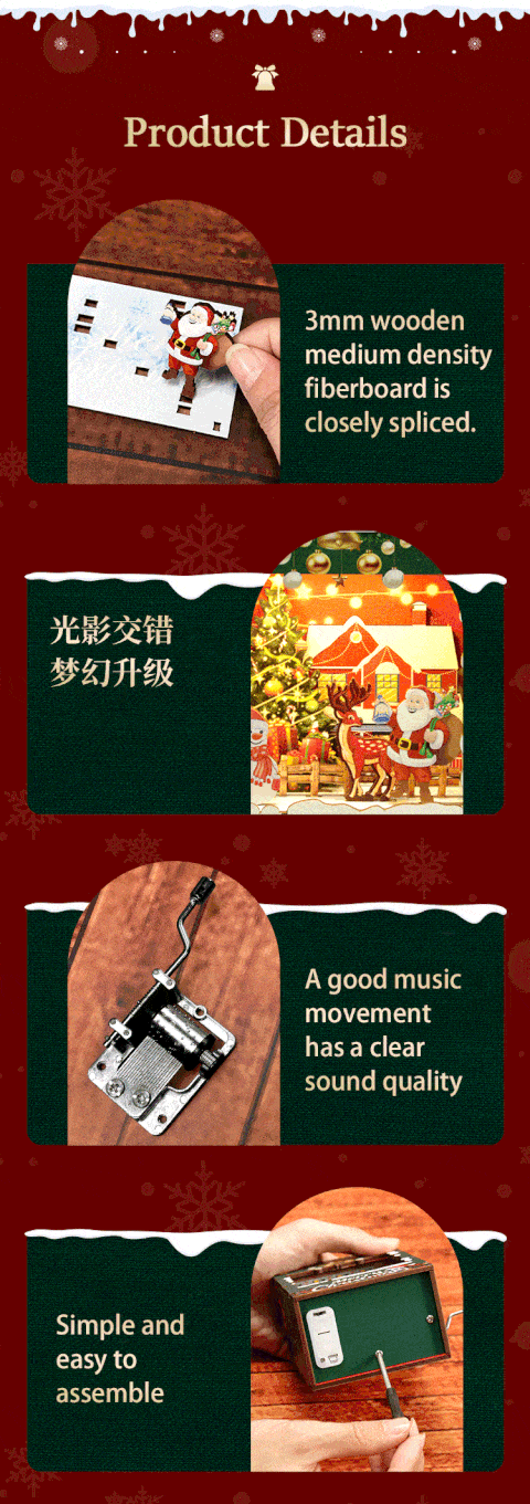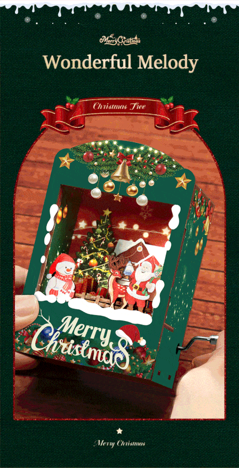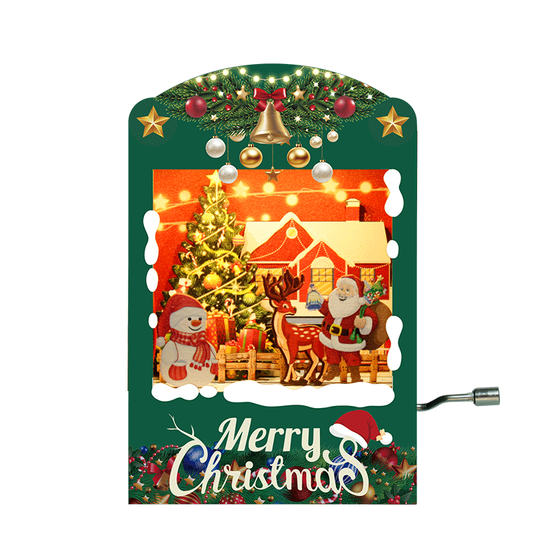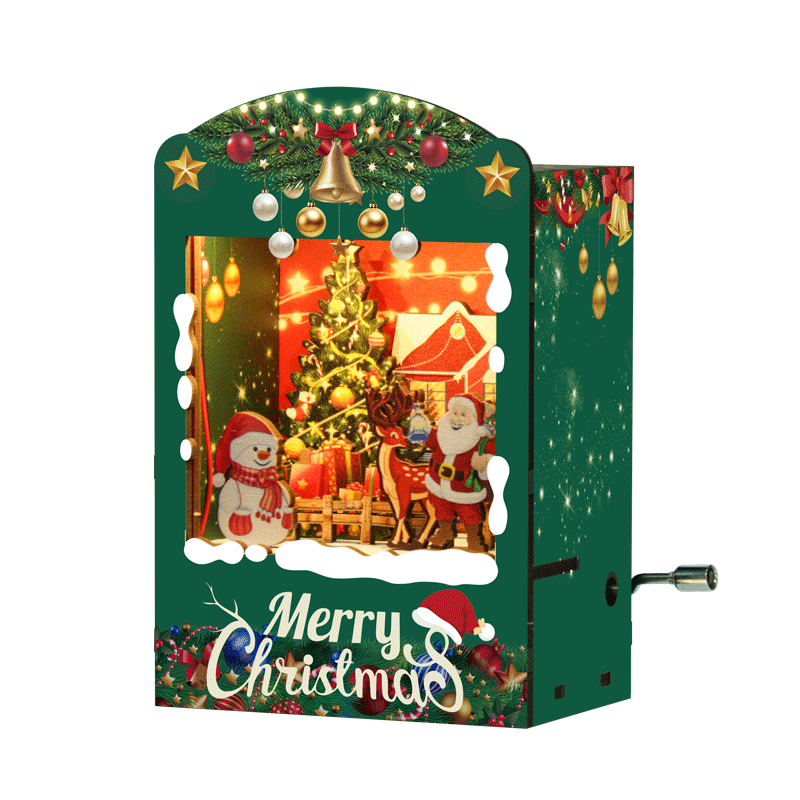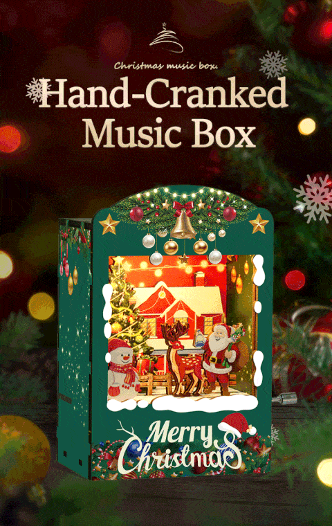 The Mini Music Box Hand Crank is a charming and creative music box crafted with precision. Made from 3mm wooden medium-density fiberboard (MDF), the pieces are closely spliced for a seamless fit. The high-quality music movement delivers clear and pleasant sound, producing beautiful melodies with every turn of the crank. Its LED light design adds a magical glow, letting you experience the cozy feeling of snow falling on a winter night. Compact and portable, this music box is Christmas-themed, perfect for placing anywhere without taking up space.