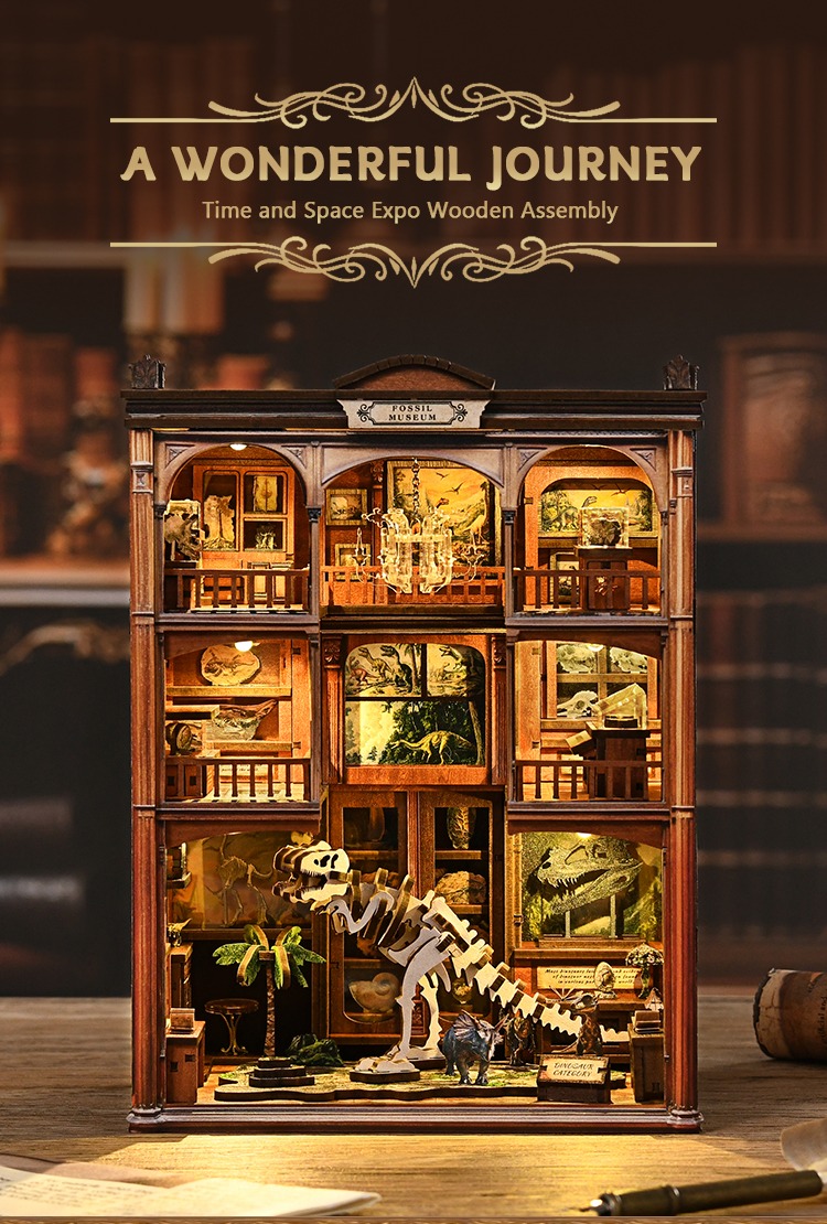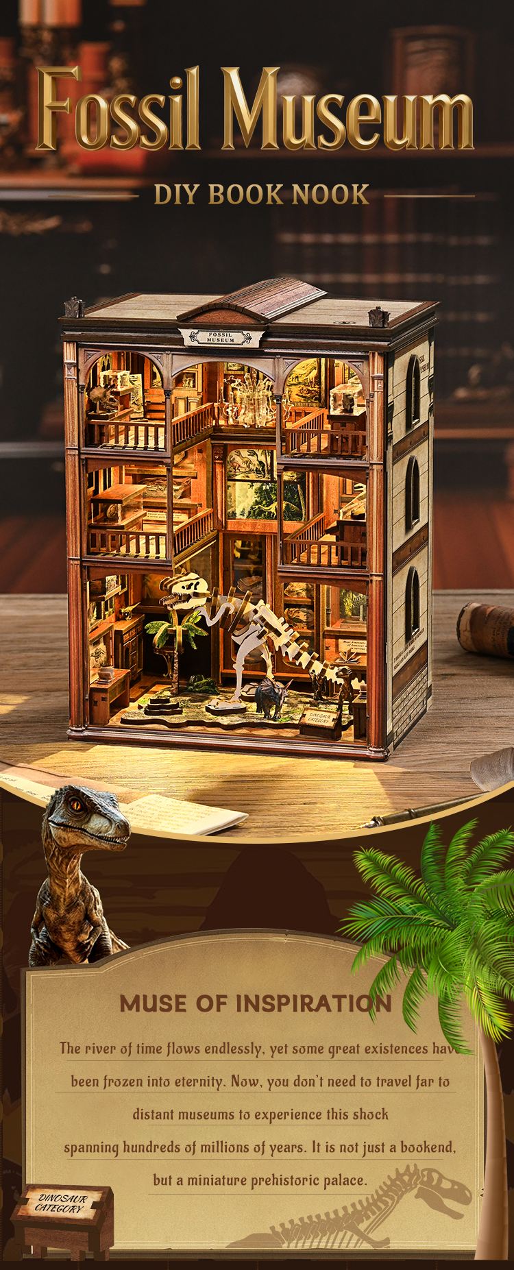 Unleash your inner architect and paleontologist with the Bookshelf Diorama Kit: Fossil Museum Miniature! This book nook for Shelf is not just a decorative item—it's a portal to an ancient world, perfect for collectors and DIY enthusiasts alike. As part of the popular diy mini house kit series, this model combines the thrill of build mini houses with the fascination of paleontological discovery. Immerse yourself in a miniature world of dinosaur fossils and crystal ceiling lights as you create a detailed fossil museum display to adorn your bookshelf.