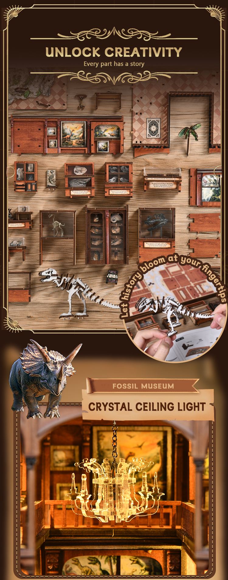 The kit includes everything you need to bring a spotlight book nook or bookshelf alley to life. Whether you're adding character to your home, office, or bookstore, this diorama makes a striking statement piece. Crafting it will take you on a nostalgic journey through time, where fossil skeleton details and acrylic display cabinets transport you to an era long past.