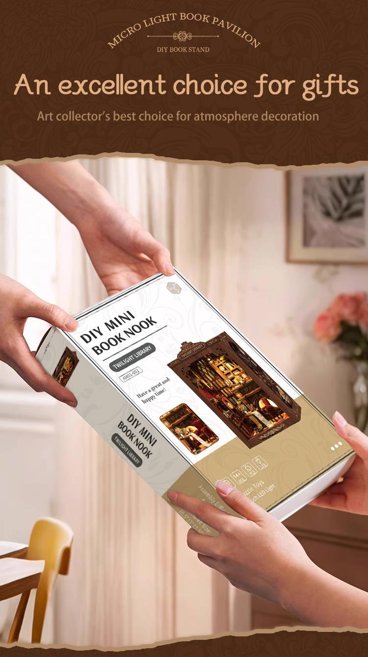 Discover the charm of a tiny literary world with the Weiguang Book Nook, a beautifully crafted hand craft miniature house DIY kit designed to turn your bookshelf into a work of art. Made from premium MDF for a sturdy build, this kit features finely detailed, 3D-printed components with crisp, clear printing.