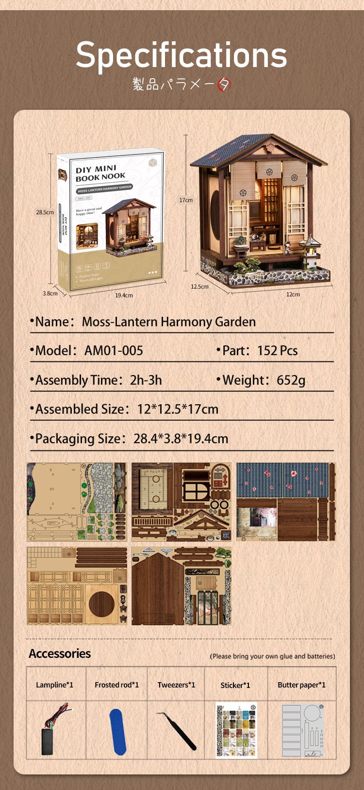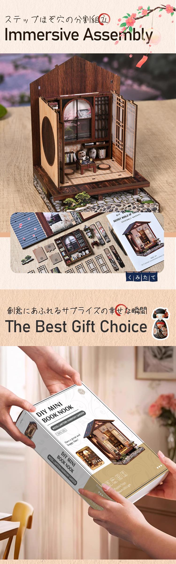 Recreate the aesthetics of Japanese-style living and craft a healing courtyard in the palm of your hand with the Moss Lamp and Garden DIY Mini House. This miniature DIY kit draws inspiration from traditional Machiya townhouses, featuring deep brown wooden frames, sliding shoji doors, and tiled roofs. Inside, the layout includes elegant bookshelves, screen tea tables, and small tabletop ornaments. Outside, a dry landscape (kare-sansui) style is created with stone lanterns, miniature pathways, and falling cherry blossom decorations.