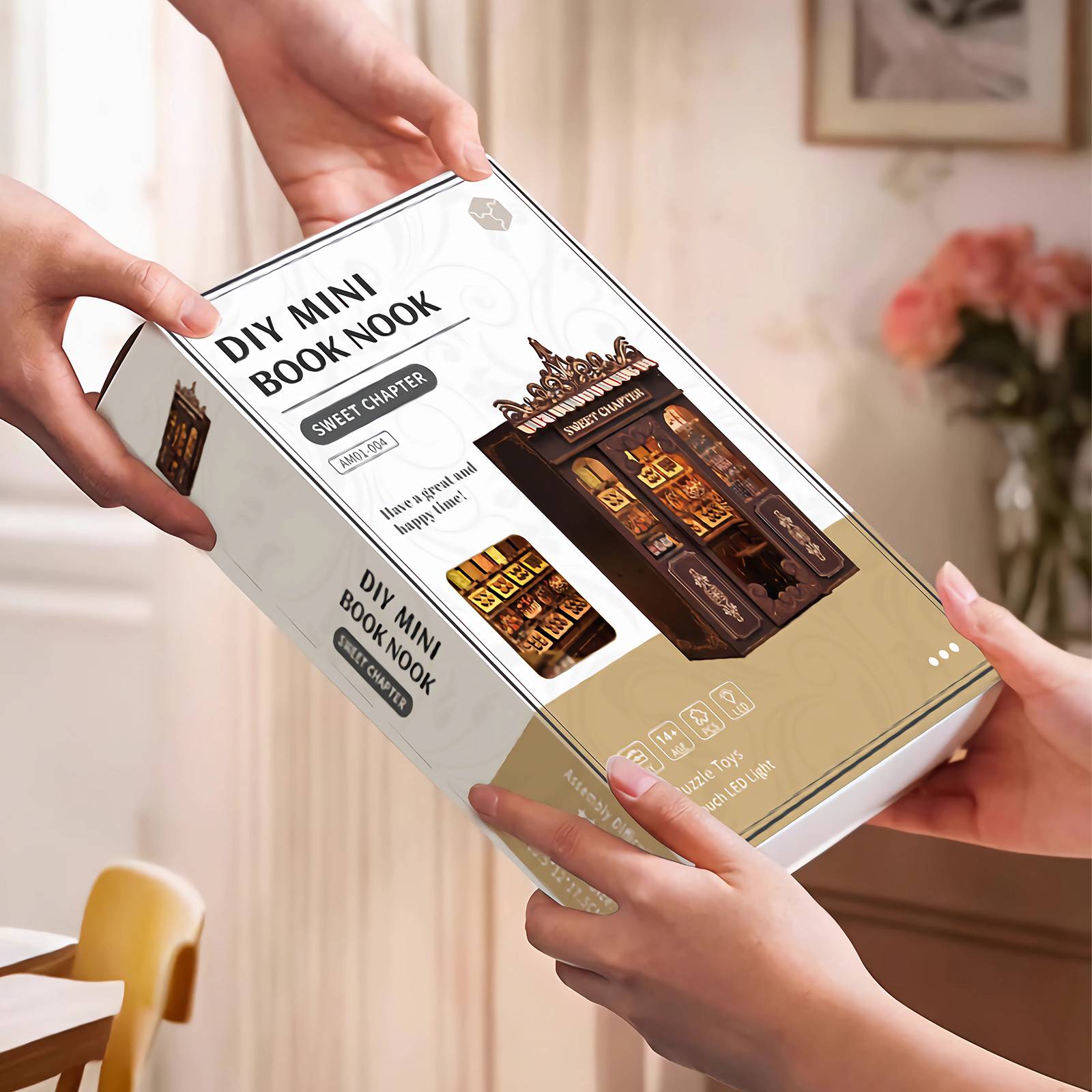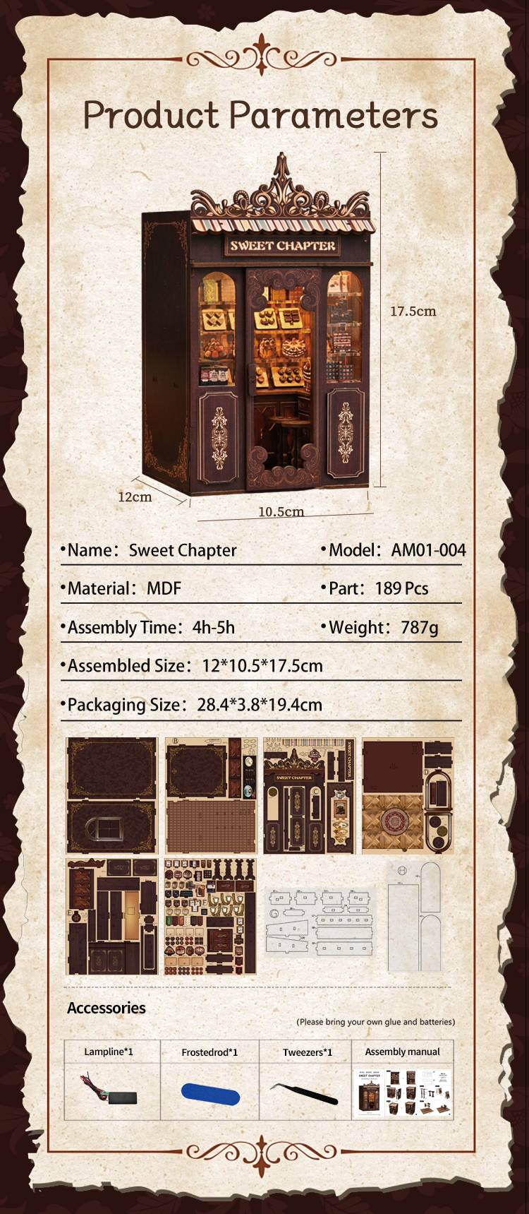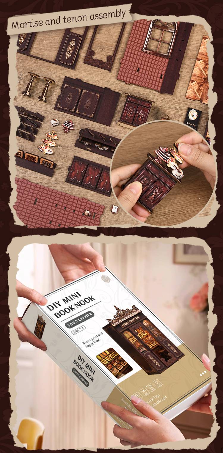 Step into the whimsical world of the Sweet Chapter DIY Mini House—a charming little dessert house that you can craft with your own hands. This miniature house, designed with a classic British charm in deep coffee colors, evokes the sweet essence of joy and surprise. A gently opening front door reveals a world of tempting desserts, illuminated by soft, welcoming light. Perfect for craft enthusiasts, this DIY project offers a heartwarming way to create your own slice of magic.