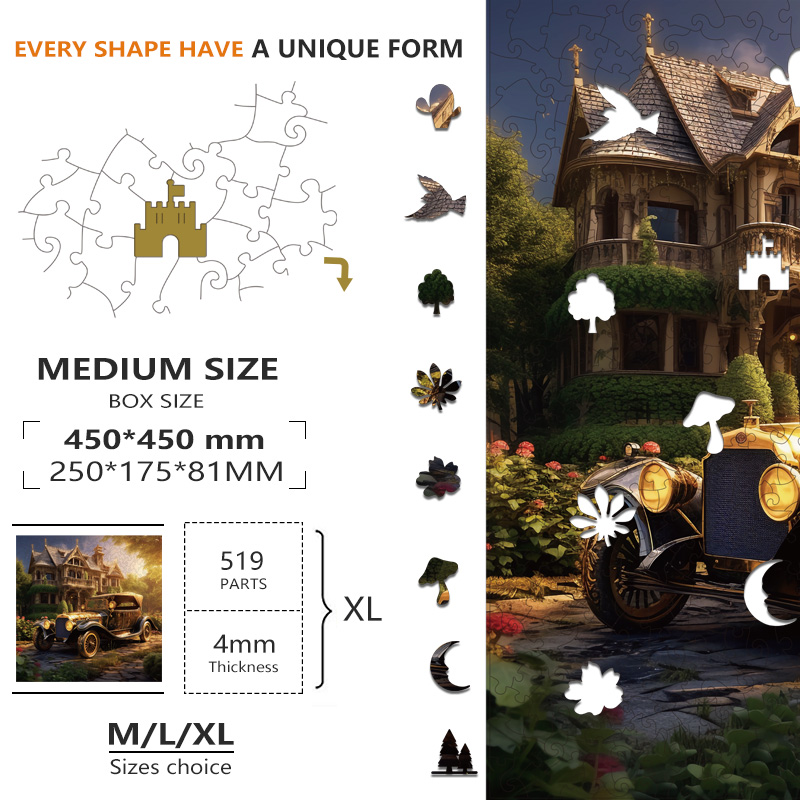 The 3D Castle Puzzle is a beautifully designed 3D puzzle castle that brings a touch of vintage charm into your home. This castle jigsaw puzzle features intricate details, including a classic castle scene with a vintage car, giving it a unique and realistic appearance. Made from high-quality 4mm poplar plywood, each piece is precision-cut with a laser cutting process to ensure smooth edges that are safe for hands.