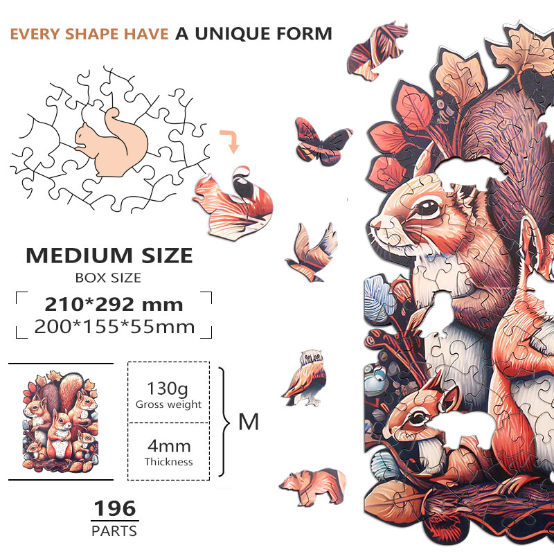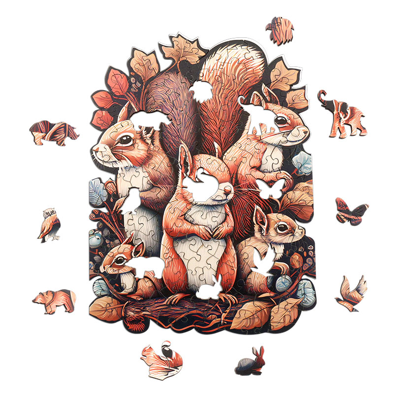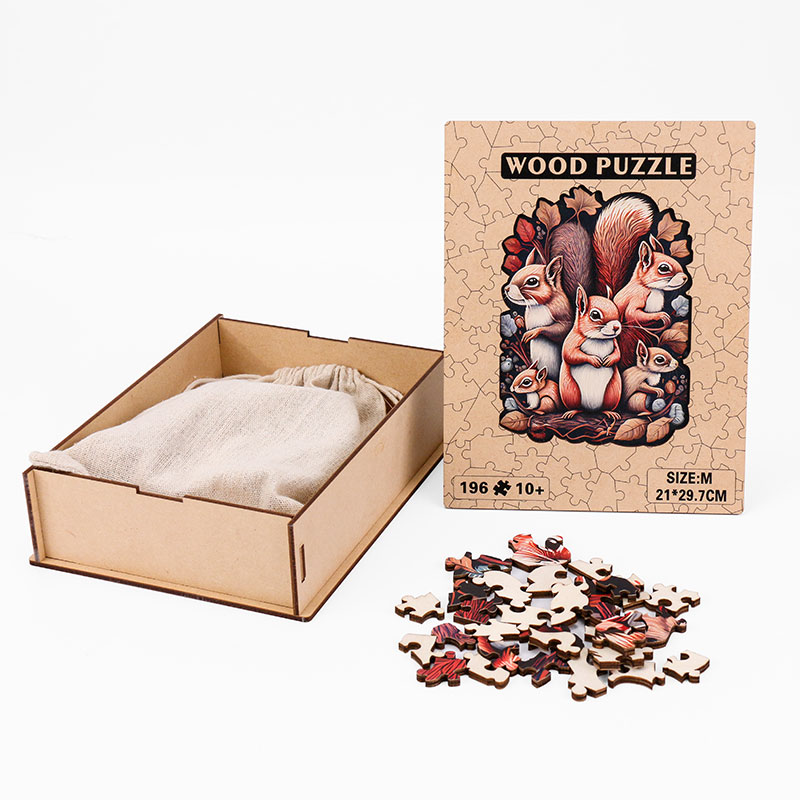 Bring the charm of nature into your hands with our Squirrel Wooden Puzzle, a beautifully designed squirrel jigsaw puzzle made from eco-friendly Poplar plywood. Using high-precision laser cutting, each piece is carefully crafted to form graceful squirrel shapes. Multi-layer color UV printing adds bright, vivid colors and exquisite texture, making this wooden squirrel puzzle not only a fun challenge but also a stunning decorative piece. Perfect for children, adults, and puzzle enthusiasts, these puzzles can be assembled as a complete image or as separate entities, providing hours of engaging fun.