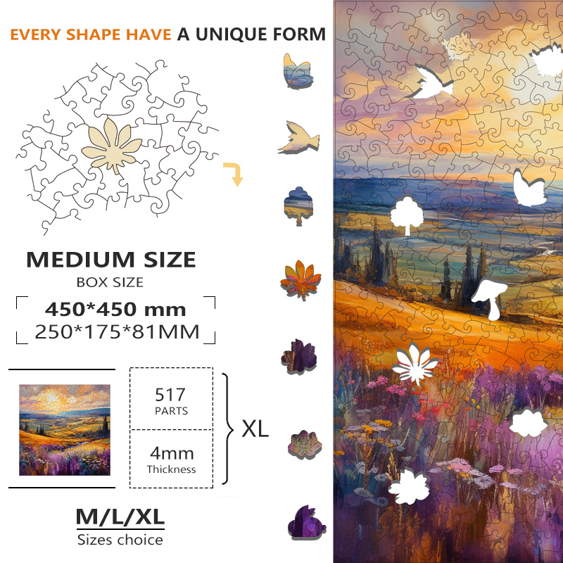 The Sunset Jigsaw Puzzle is a beautifully crafted wooden puzzle designed to capture the enchanting colors and tranquility of a sunset. Each piece is precision-cut from 4mm thick poplar plywood using high-precision laser technology and features multi-layer UV printing for vibrant, long-lasting colors. This puzzle combines creativity, artistry, and relaxation, offering both a fun hands-on activity and a unique decorative piece for your home. With uniquely shaped pieces that can form a complete scene or stand alone as miniature figures, this sunset puzzle transforms traditional puzzle-solving into an artistic and immersive experience.
